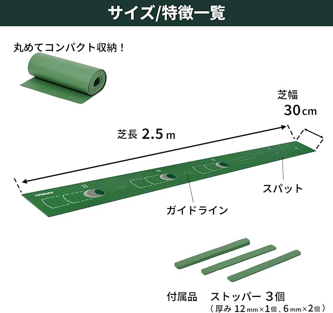 【練習に最適!長さ2.5m/芝幅30㎝】しっかりと練習ができて、かつマンションの部屋やオフィスにも敷くことができる最適な長さ2.5m。使用後はくるくる丸めて収納できるためマンション住まいでも安心です。