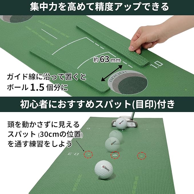 【多彩な練習方法アレンジ】自由に配置できるストッパー3つ付き。ボールストッパーとしての使用はもちろん、ガイド線に沿って配置しホールカップを小さくしてより難しくする練習など、レベルに合わせて練習方法をアレンジできます。(ガイド線に沿って配置すると幅が63㎜となります。)