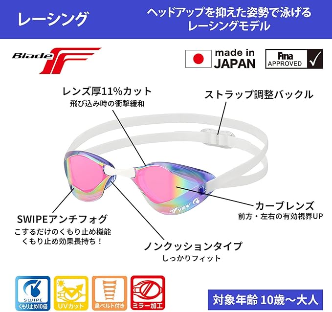 [ビュー] スイミングゴーグル BladeF 日本製 レーシング ミラータイプ ノンクッション 10歳~大人用 Fina承認モデル くもり止め機能SWIPE搭載 V122SAM
