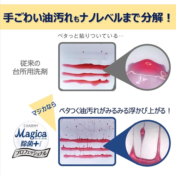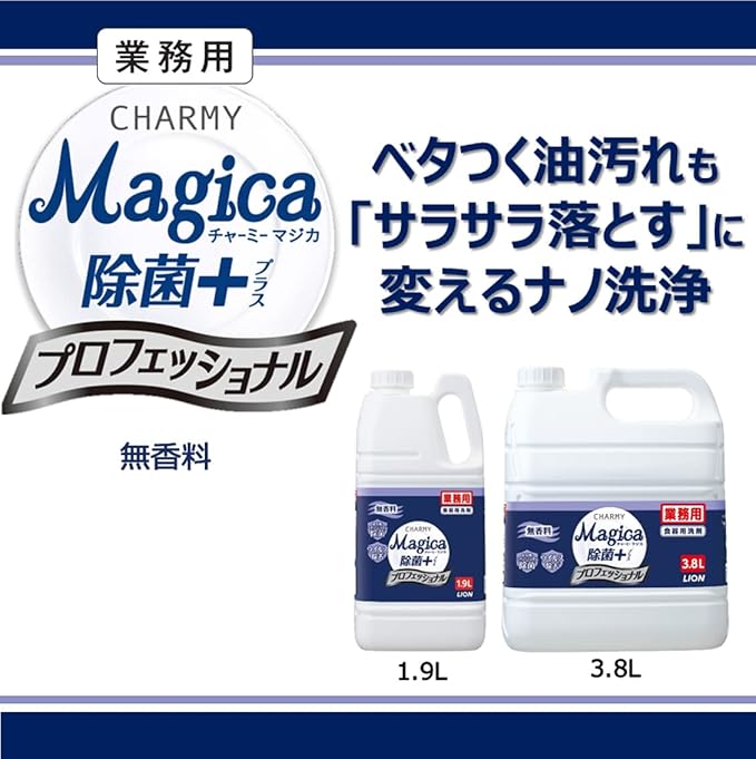 油汚れも「サラサラ落とす」。まな板・スポンジ・ふきんの除菌も。チャーミーマジカ除菌プラスプロフェッショナル。●独自のメカニズムで手ごわい油汚れをナノレベルまで分解します。●まな板、ふきん、スポンジの除菌ができます。(すべての菌を除菌するわけではありません。)※まな板の除菌:一度洗ったまな板に、原液8mlをまんべんなく塗布し、約20分間放置した後、水でよく洗い流す。スポンジ・ふきんの除菌:使用後、軽く洗って固く絞り、原液8mlをまんべんなく浸透させ、次回使用時まで置いておく、ふきんは除菌後によくすすぐ。●無香料タイプ。●従来品から洗浄成分の界面活性剤を増量。