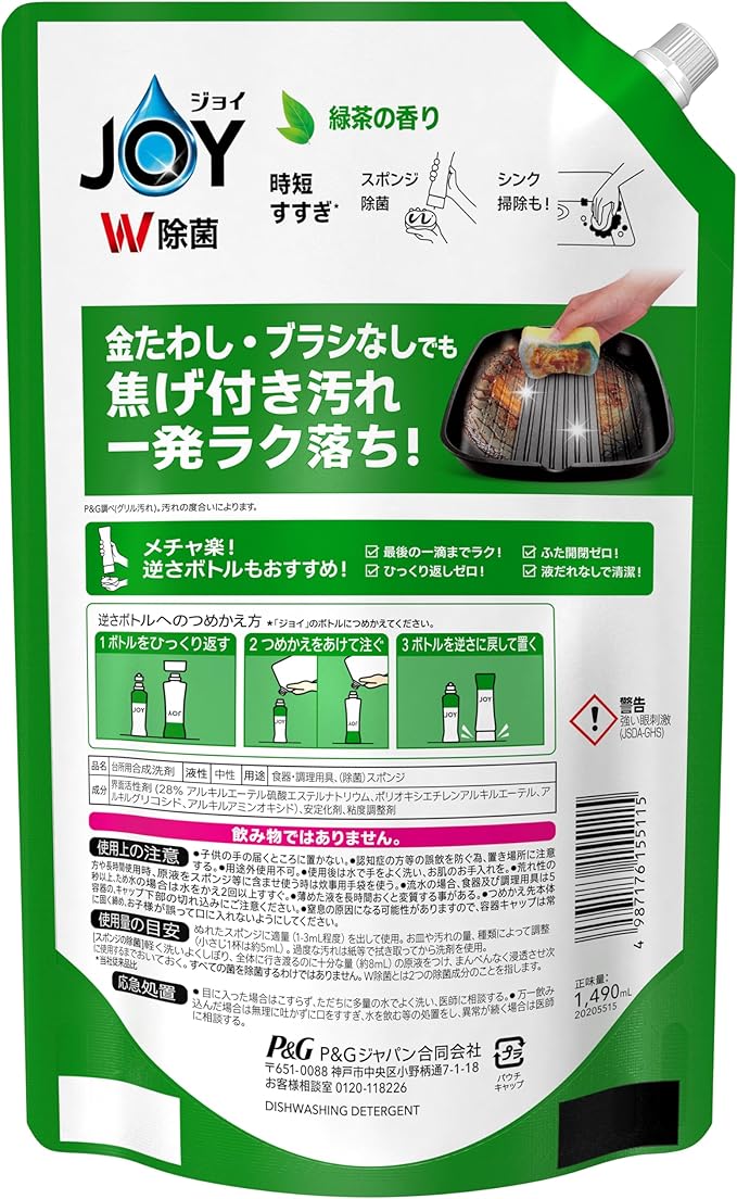 ジョイ 【まとめ買い】 [大容量] W除菌 食器用洗剤 緑茶 詰め替え 超特大ジャンボ 1,490mL 2個