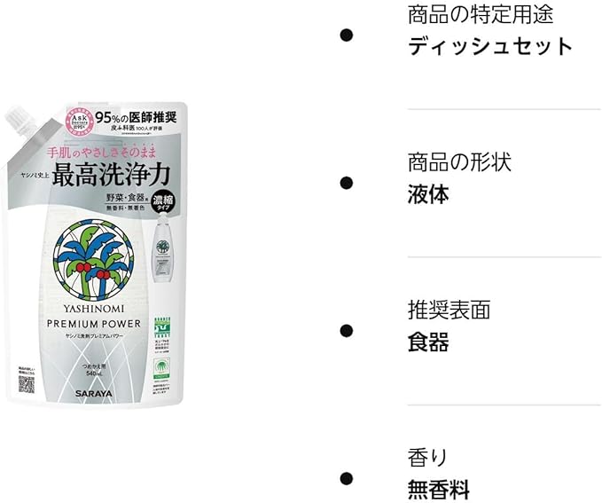 強い洗浄力と手肌へのやさしさを両立 ・汚れだけを集中的に洗浄する独自の処方。油汚れをすっきり落とし、ヤシノミ史上最高の洗浄力を持ちながらも手肌へのやさしさを両立しました。 ※皮ふ刺激テスト済み(すべての方に皮ふ刺激がおきないというわけではありません)