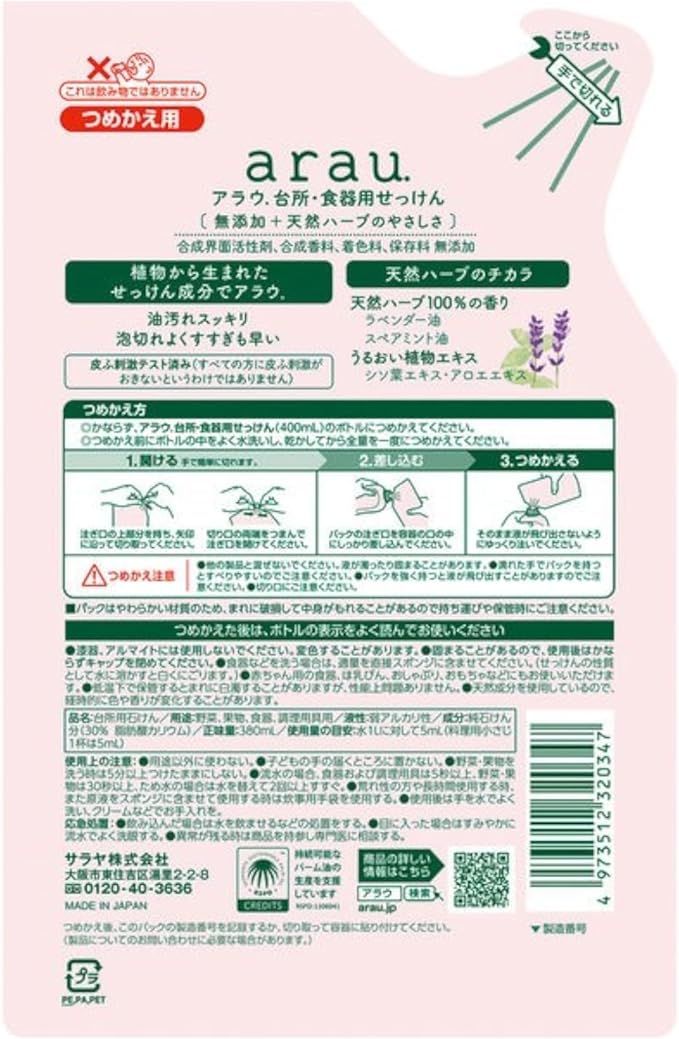 【まとめ買い】アラウ 無添加せっけん 台所・食器用 天然ハーブの香り 詰め替え用 380ml 3個セット 合成界面活性剤・合成香料・着色料・保存料無添加