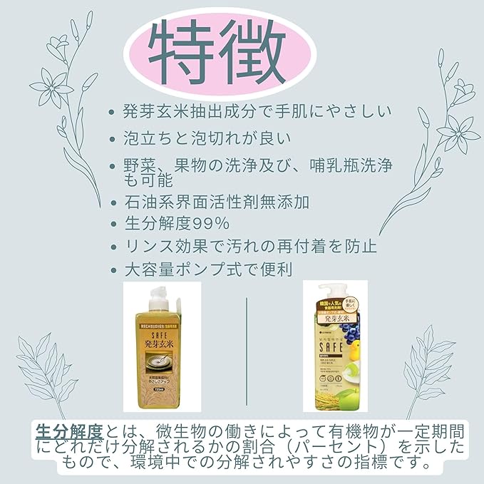 オーガニック発芽玄米成分とヤシ・ココナッツなどで作られた天然油脂由来の成分を配合した食器洗剤。