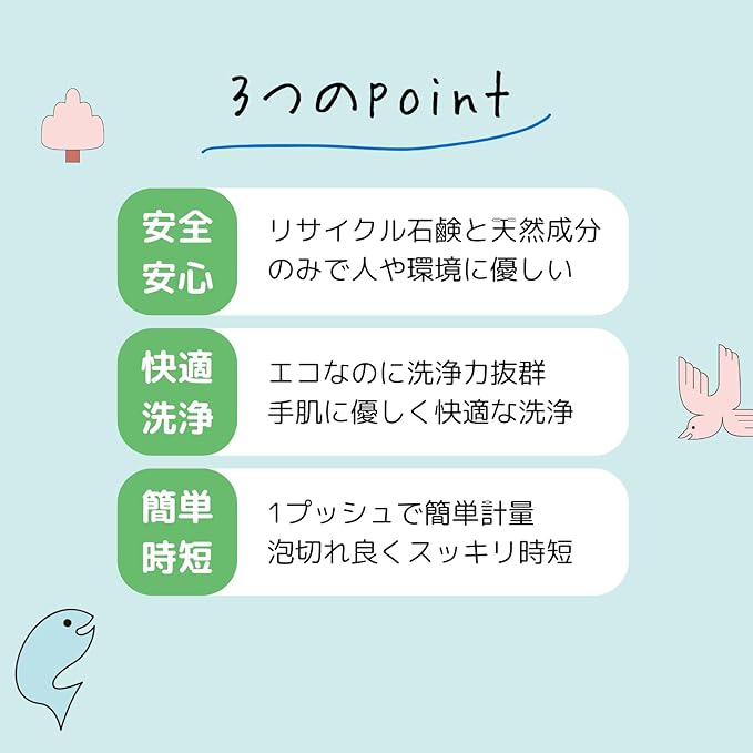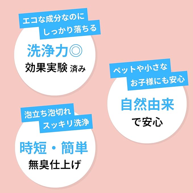 特徴 すすぎ簡単, サポニンエキス配合, 合成界面活性剤不使用, 合成香料不使用, 除菌