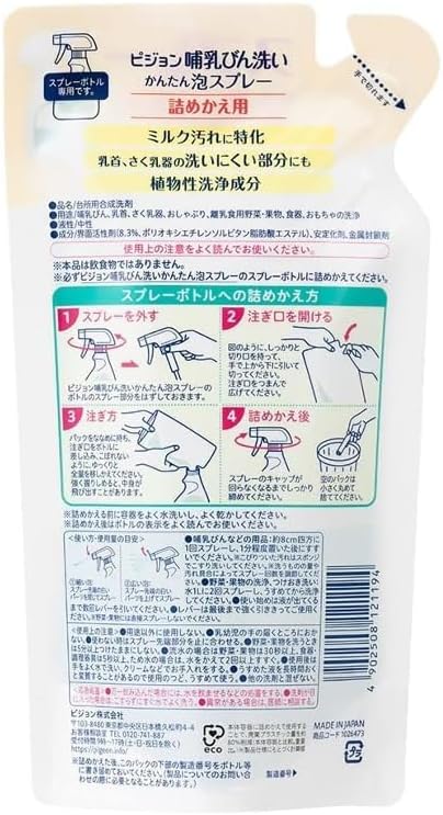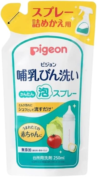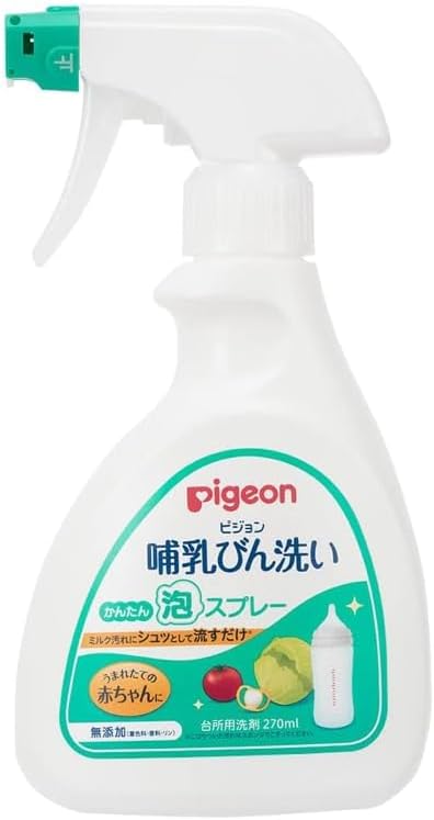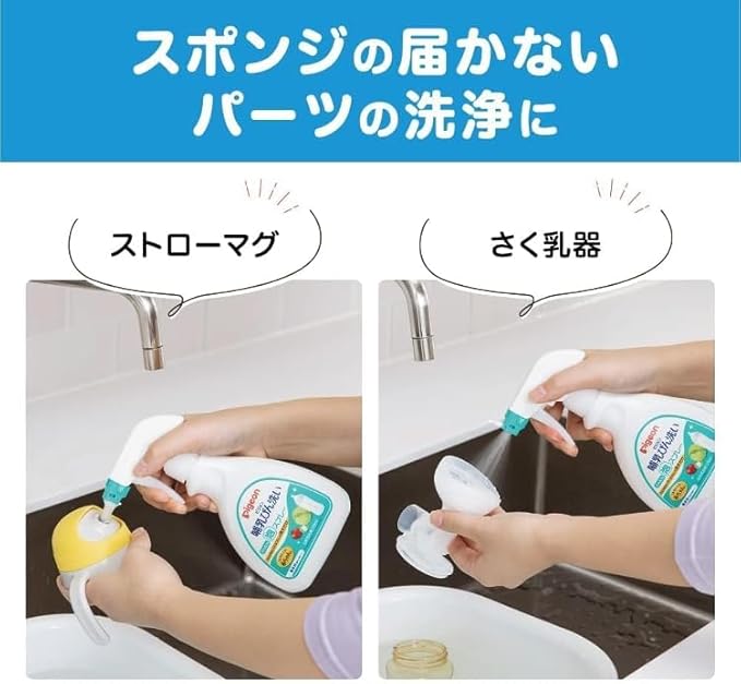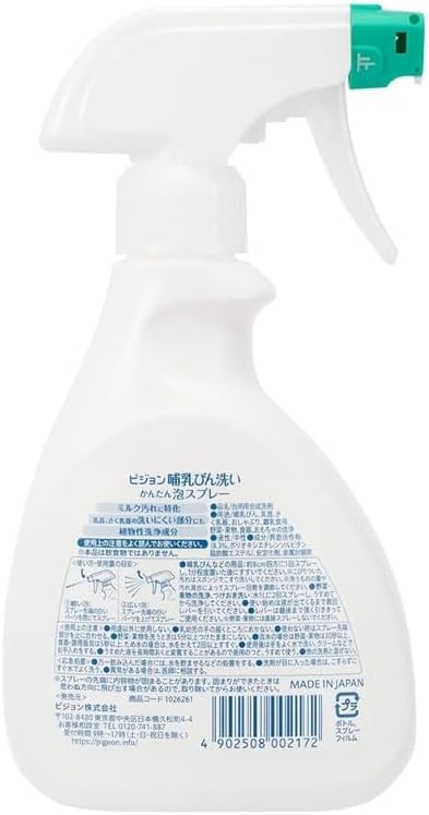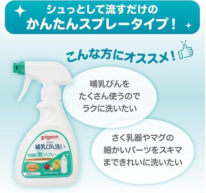 ミルク汚れにシュっとして流すだけのかんたん泡スプレー!植物由来の洗浄成分の哺乳びん洗いです。 野菜も洗える、赤ちゃんの口に入るものをしっかり洗える洗剤です。 普通のスポンジでは洗いにくい乳首やさく乳器の洗浄にもオススメ。