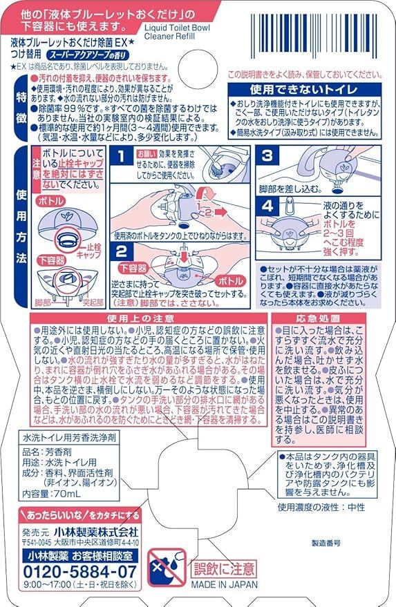 【まとめ買い】 液体ブルーレット除菌イーエックス(EX) 液体ブルーレットおくだけ 除菌 スーパーアクアソープの香り 詰め替え用 70ml 8個 トイレタンク芳香洗浄剤 小林製薬