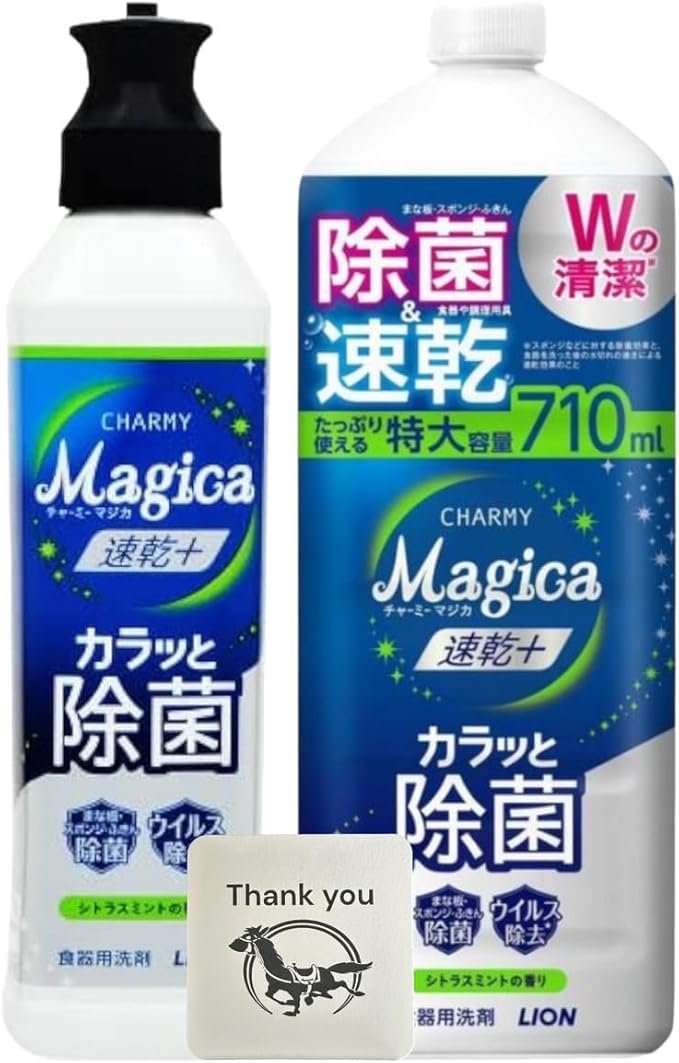 ライオン チャーミー マジカ CHARMY Magica 食器用洗剤 からっと速乾 速乾プラス 除菌 食器用 洗剤 シトラスミントの香り 本体 220ml + 詰め替え 710ml 各種1個セット + Kunutonnオリジナルロゴ入りおまけ付