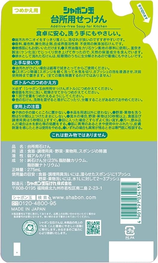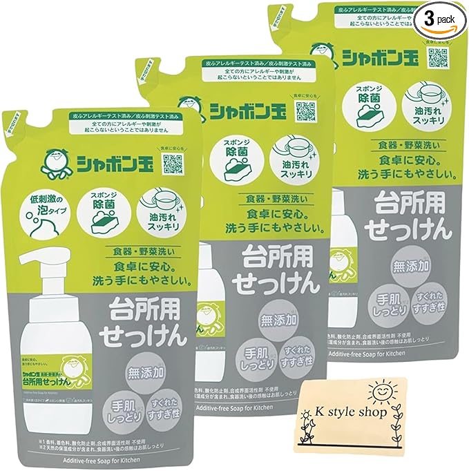手肌にやさしい無添加の台所用せっけんです。低刺激の泡タイプで、食器や野菜洗いに最適。油汚れもスッキリ落とし、スポンジでの除菌効果も期待できます。食卓に安心をお届けする日本製の洗剤で、手肌をしっとり保ちながら優れた洗浄力を発揮します。275mlの詰め替え用パックが3個セットになっており、経済的です。環境に配慮された詰め替えパックタイプで、使いやすい設計になっています。食器洗いはもちろん、調理器具や野菜の洗浄にも適しており、毎日の台所仕事を快適にサポートします。手肌への優しさと確かな洗浄力を両立した、信頼できる台所用せっけんです。