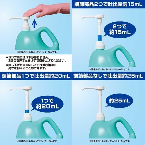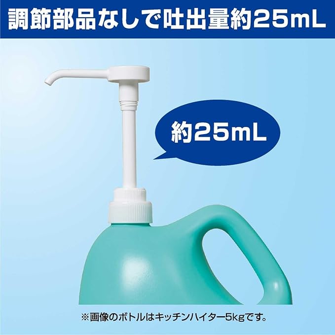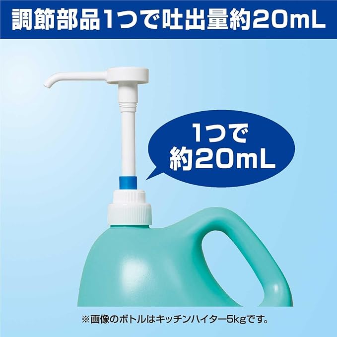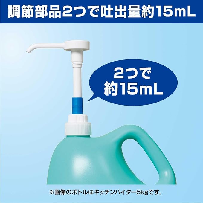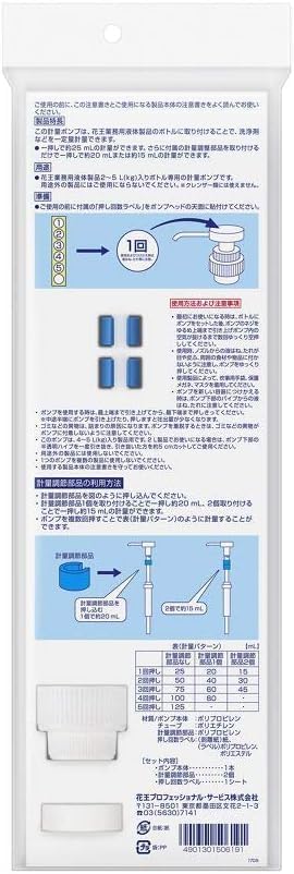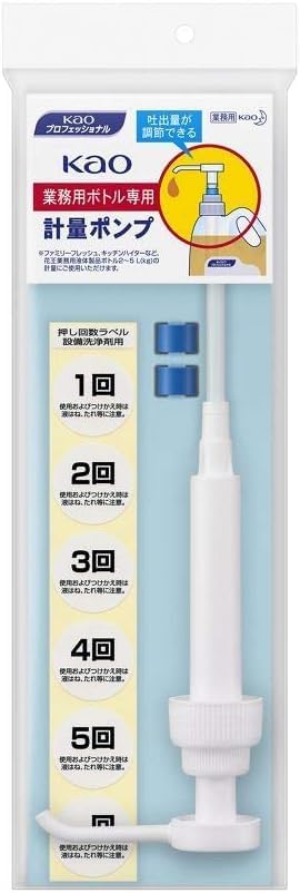 特長と使い方1. 従来の定量型とは違い、計量調整部品を装着するだけで吐出量の調整ができます。 (計量調整部品装着なし→25cc/1回押し、計量調整部品1個装着→20cc/1回押し、2個装着→15cc/1回押し) 2.使用時のポンプ押し回数が一目で分かるシール付です。3.花王業務用洗剤商品2L、4.5L、5L(kg)入りボトルにご使用いただけます。 商品に関するお問合せ・ご意見は花王プロフェッショナル・サービス(株) 03-5630-7141受付時間:9:00~17:00 (土・日・祝日・年末年始・夏季休暇は除く)