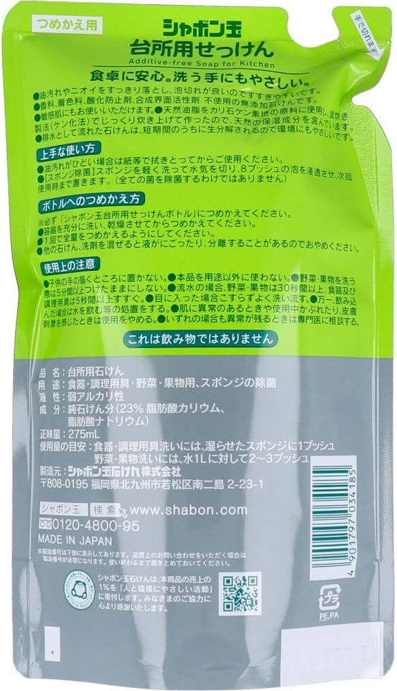 【商品詳細】 個装サイズ:120mmX200mmX32mm 個装重量:約300g 内容量:275mL 成分:純石けん分(23 Percent 脂肪酸カリウム、脂肪酸ナトリウム) 液性:弱アルカリ性 用途:食器・調理器具・野菜・果物用、スポンジの除菌 製造国:日本 発売元:シャボン玉石けん JANコード:4901797034185