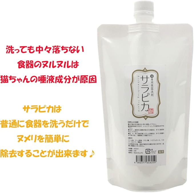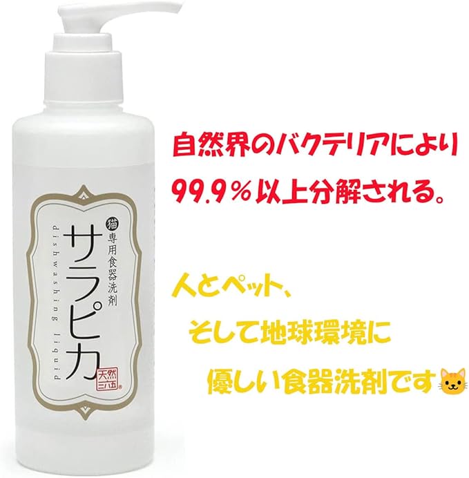 サラピカは、自然界のバクテリアにより99.9%以上分解される、人とペット、そして地球環境に優しい食器洗剤です。フードボウルや水飲みボウルをサラピカで洗うことで、天然成分の除菌効果が食器を清潔に保ちます。また、普通に洗ってもなかなか落ちないヌルヌルは、猫の唾液の成分が原因です。サラピカは普通に食器を洗うだけで簡単にヌメリを除去することが可能です。洗浄力が高く泡切れも良いので、少量で経済的にお使いいただけます。 もちろん、香料、着色料、防腐剤、合成保存料などの人工添加物は一切不使用です。