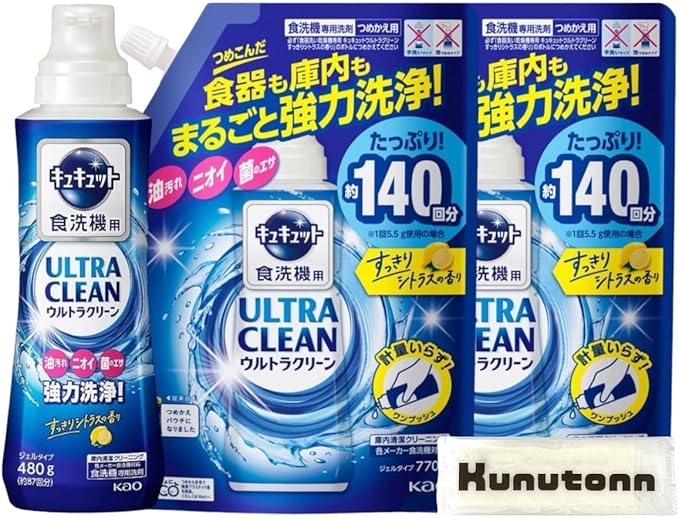 キュキュット ウルトラクリーン 食洗機用 洗剤 強力洗浄 シトラスの香り 本体 480g 1個 + 詰め替え 770g 2個セット + Kunutonnオリジナルロゴ入りhおしぼり付