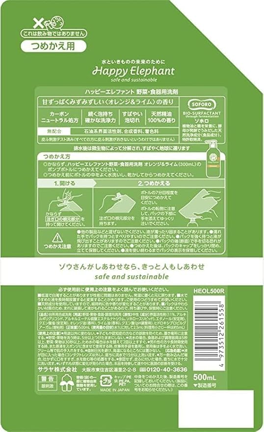 サラヤ 洗剤 ハッピーエレファント 野菜 食器用洗剤 オレンジ&ライム 詰め替え 500ml 5個セット