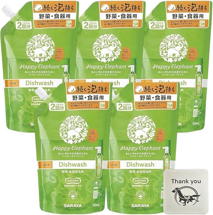 サラヤ 洗剤 ハッピーエレファント 野菜 食器用洗剤 オレンジ&ライム 詰め替え 500ml 5個セット + Kunutonnオリジナルロゴ入りおまけ付