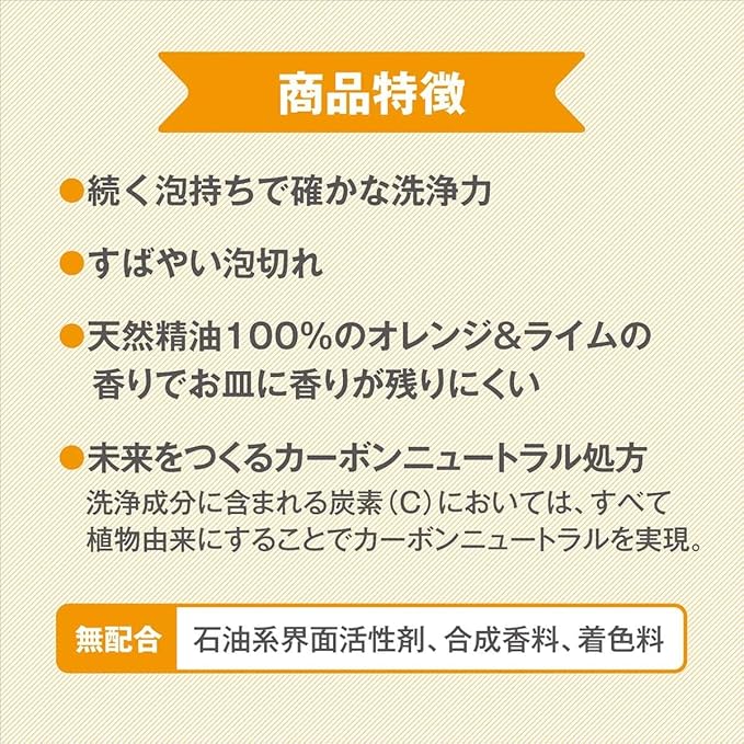 界面活性剤(11%、アルキルポリグリコシド、アルキルエーテル硫酸エステルナトリウム、ソホロースリピッド)、エタノール(安定剤)、クエン酸塩(安定剤)、オレンジ油(香料)、ライム油(香料)、クエン酸(pH調整剤)、ヒドロキシプロピルグアーガム(増粘剤)