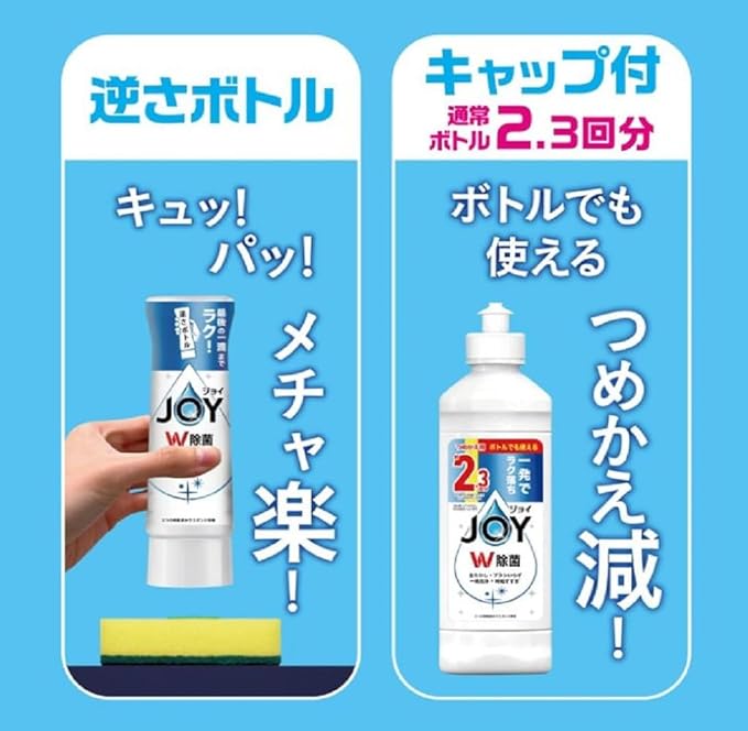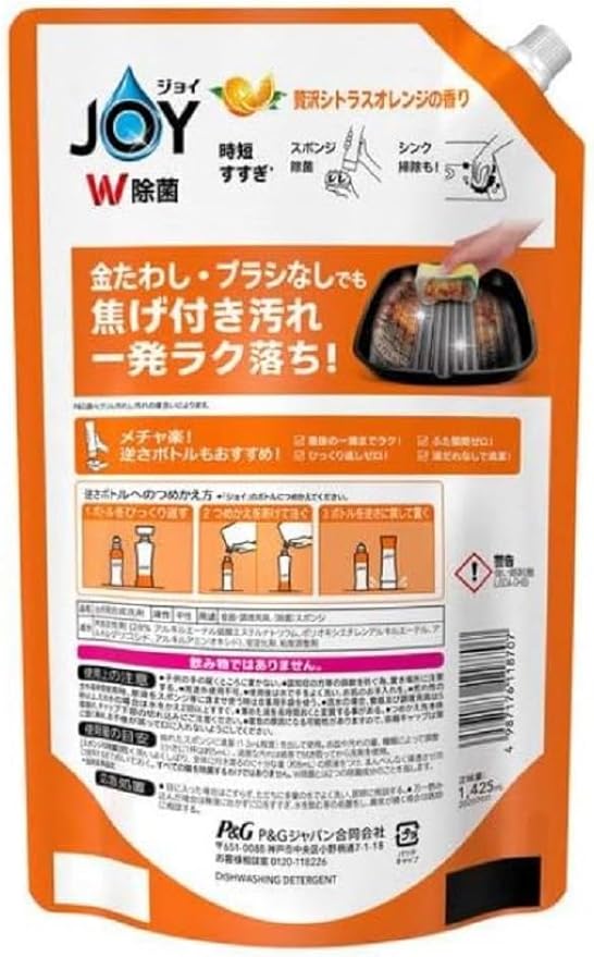 「ジョイ W除菌 食器用洗剤 シトラスオレンジ」は、強力な洗浄力とW除菌効果を兼ね備えたキッチン用洗剤です。使いやすい逆さボトル290mLと、たっぷり使える超特大ジャンボサイズ1425mLの詰替えセットで、頻繁な買い足し不要。爽やかなシトラスオレンジの香りで、食器洗いが快適に。頑固な油汚れやニオイをしっかり落とし、食器やスポンジを清潔に保ちます。