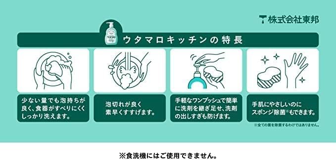 頑固な油汚れに強いのに、手肌にやさしい。 ウタマロキッチンは、アミノ酸系洗浄成分を主成分とした食器用洗剤です。少量でもしっかり泡立ち、泡切れも良く、しつこい油汚れやニオイもスッキリ落とします。 本商品は、250mlの詰め替え用が3個入ったお得なセット。継続して使いたい方、家族でたくさん使う方にも最適です。 毎日の食器洗いで気になる「手荒れ」対策にも配慮。弱酸性&無着色、合成香料も使用せず、手肌への刺激を抑えた処方で、敏感肌の方やお子さまのいるご家庭でも安心してご使用いただけます。 さらに、ウタマロキッチンはスポンジ除菌も可能。洗剤をスポンジに浸透させておけば、次回使用時まで菌の繁殖を抑える効果が期待できます。※すべての菌を除去するわけではありません。 炒め物や揚げ物後のフライパン、カレーの容器や油がこびりついたお弁当箱など、落ちにくい汚れにも大活躍。 洗浄力・やさしさ・コスパの三拍子がそろった、家庭用洗剤の定番です。