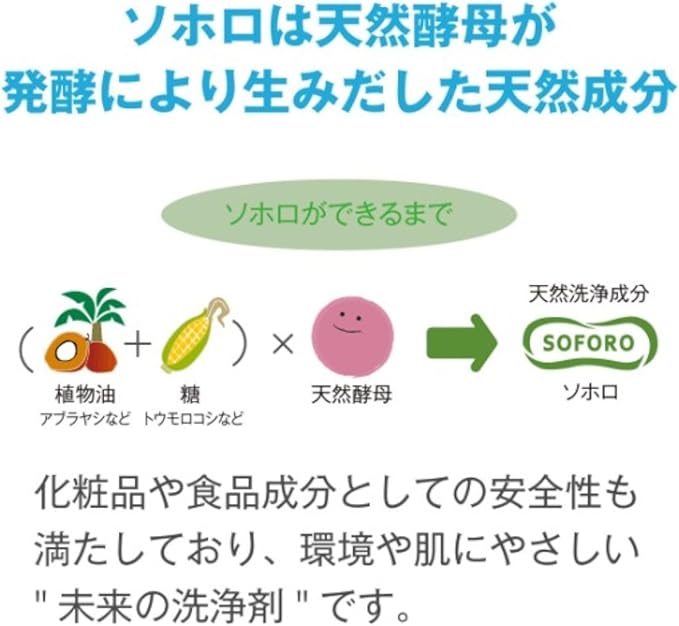植物油と糖を栄養に、酵母が発酵でうみだした天然洗浄成分ソホロと非石油系の植物性洗浄成分を配合した洗剤で、排水は微生物によって分解され、すばやく地球に還ります
