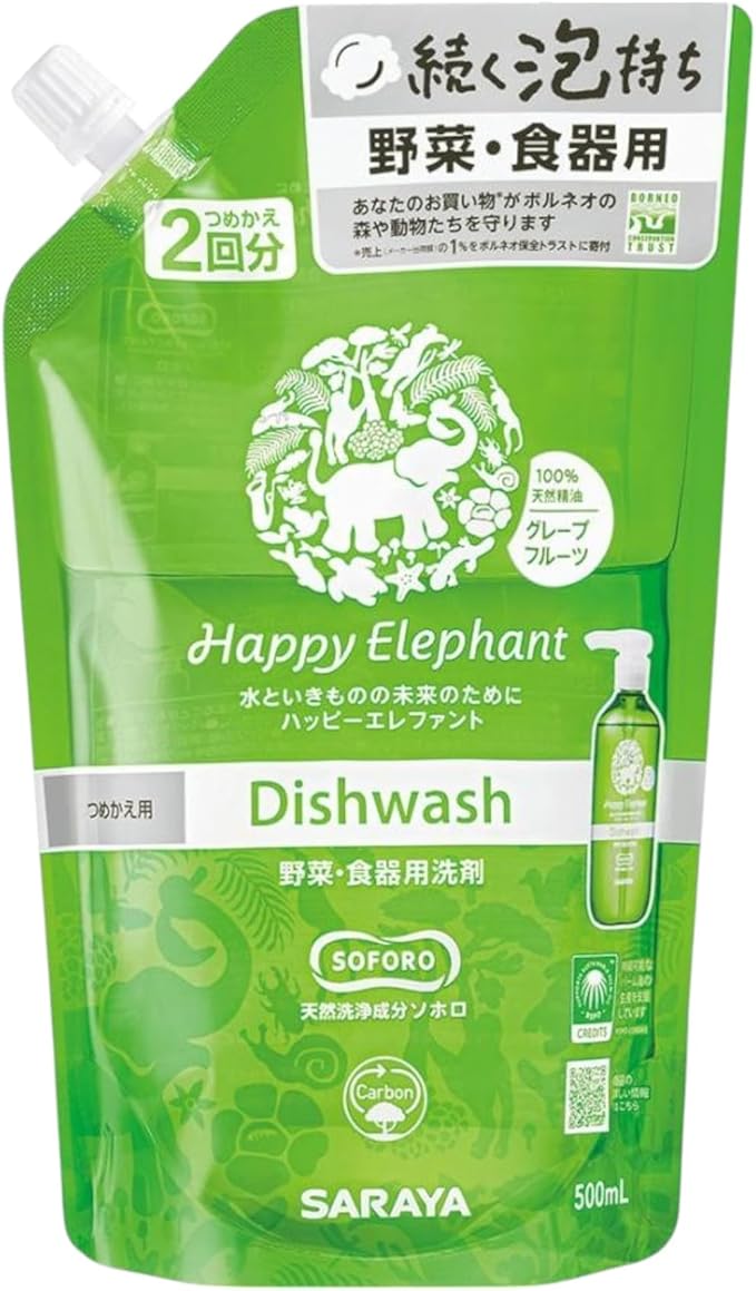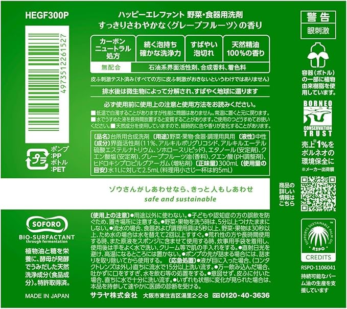 サラヤ ハッピーエレファント 野菜・食器用洗剤 グレープフルーツの香り 本体 300ml + 詰め替え用 500ml 石油系界面活性剤・合成香料・着色料 無配合