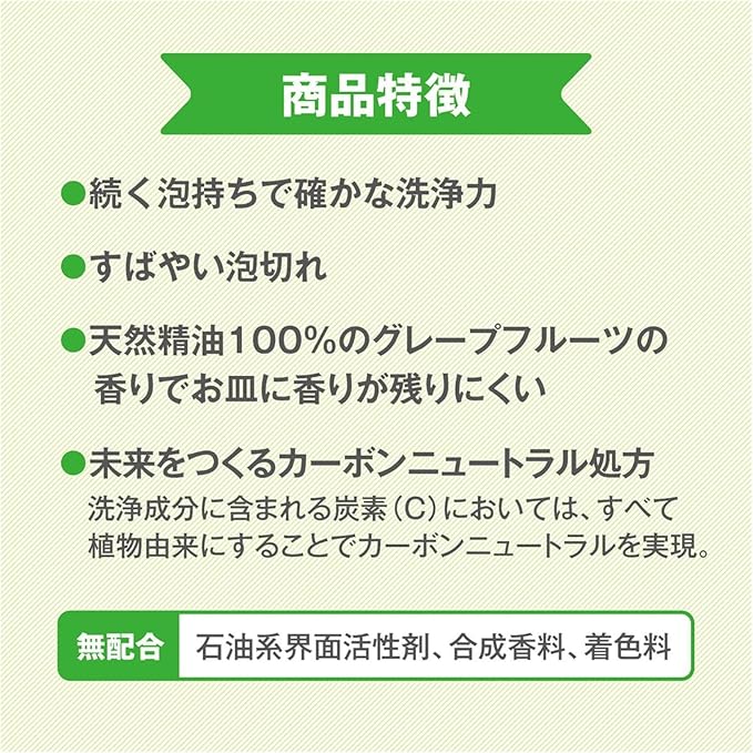 商品紹介: 処方のリニューアルを行い、泡持ちがよくなりました! 植物油と糖を栄養に、酵母が発酵でうみだした天然洗浄成分ソホロと非石油系の植物性洗浄成分を配合した洗剤で、排水は微生物によって分解され、すばやく地球に還ります。 天然洗浄成分ソホロを配合することで高い洗浄力を実現しています。 また、すすぎ性にも優れ、すばやい泡切れで食器洗いの時短と節水にもなります。 肌トラブルの恐れのある石油系合成界面活性剤等は無配合。 手肌と環境にやさしい洗剤です。 グレープフルーツのリフレッシュな香りは天然精油100%だからお皿に香りが残りにくいです。 合成香料ではない、ナチュラルな香りが広がり癒されます。 ●石油系界面活性剤、合成香料、着色料は無配合。 皮ふ刺激テスト済み※すべての方に皮ふ刺激がおきないというわけではありません。