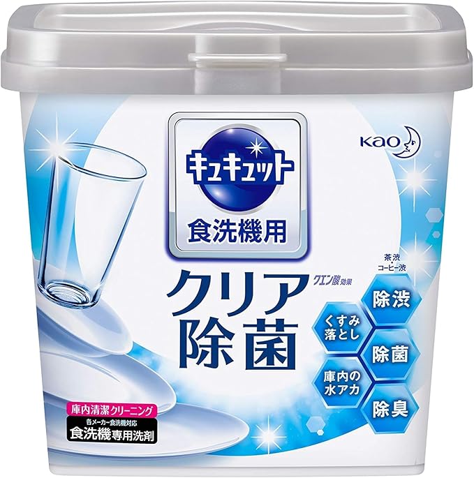 花王(Kao) キュキュット 食器用洗剤 食洗機用 クエン酸効果 商品の説明 食洗機につめこんだ食器も庫内もまっさら清潔! 油汚れもしっかり洗浄!洗うたび、除菌※・スッキリ消臭!ご飯粒・卵などのこびりつき汚れも強力分解。 茶渋・コーヒー渋、くすみも落として、グラスや食器がクリアな仕上がりに。 庫内の水アカを落とし、油汚れが残るのを防ぐ、庫内清潔クリーニング。 食器の量に合わせて適量投入できる計量スプーン入りの本体ボックス。 約150回*使えます。※すべての菌を除菌するわけではありません。*1回4.5g使用した場合 成分/界面活性剤(3%、ポリエーテルポリオール)、アルカリ剤(炭酸塩)、工程剤(硫酸塩)、漂白剤(炭酸塩)、水軟化剤(クエン酸塩)、表面改質剤、分散剤、漂白活性化剤、酵素 使用上の注意 ●子供の手の届く所に置かない。 ●認知症の方などの誤食を防ぐため、置き場所に注意する。 ●用途外に使わない。 ●電気ポットのクエン酸洗浄には使えない。 ●容器に水を入れない。破裂することがある。 ●使用後は必ずフタをきちんと閉め、湿気の少ない場所に保管する。 原材料・成分 界面活性剤、アルカリ剤、工程剤、漂白剤、水軟化剤、分散剤、表面改質剤、漂白活性化剤、酵素