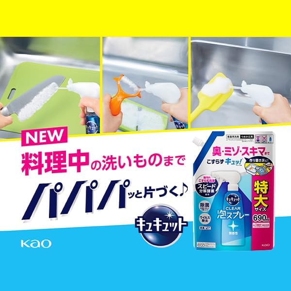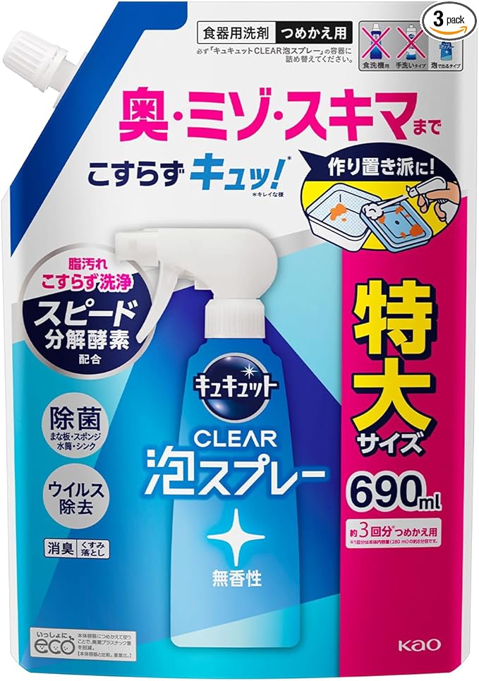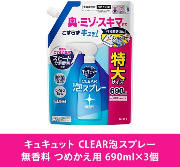花王(Kao) キュキュット クリア泡スプレー 食器用洗剤 無香性つめかえ用 720ml 3個 ツメカエ690ML*3