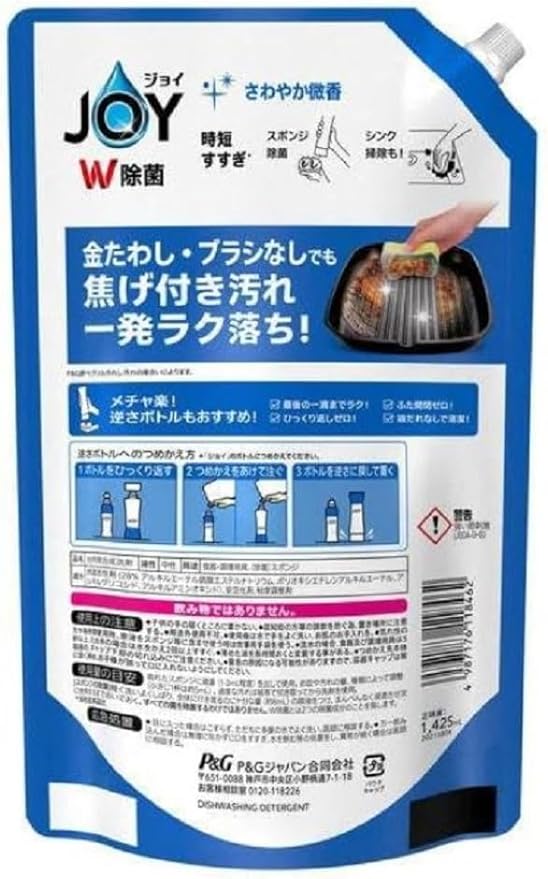 「ジョイ W除菌 食器用洗剤」は、強力な洗浄力と除菌効果を兼ね備えたキッチン用洗剤です。逆さボトルタイプの290mLと、たっぷり使える超特大ジャンボサイズ1425mLの詰替えセットで、頻繁に買い足す手間を省けます。さわやか微香で、食器や調理器具の油汚れやニオイをしっかり落とし、清潔なキッチンをキープ。スポンジの除菌も可能で、衛生的な食器洗いをサポートします。