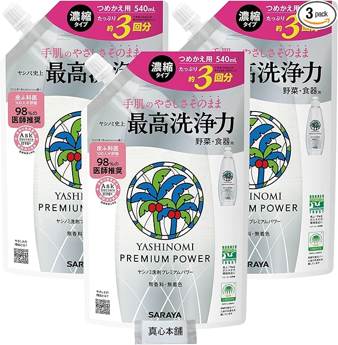 【まとめ買い】 サラヤ ヤシノミ洗剤 プレミアムパワー 濃縮タイプ 詰め替え用 540ml 3個セット 台所用洗剤 無香料・無着色