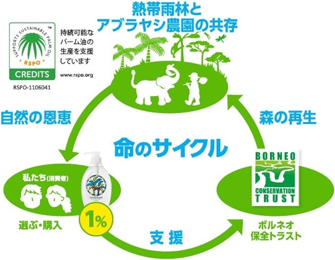 洗浄成分はヤシの実由来の植物性。洗った後の排水は微生物によって水と二酸化炭素にすばやく分解され地球に還り、環境にも配慮した食器用洗剤です