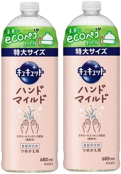 キュッと洗えて手にやさしい。スキンケア発想の食器用洗剤です。食器洗い中の手肌をいたわりたい人に向けた、うるおいキープ処方*。油汚れにも強く、一度にキュキュッと落とします。カモミールの香り。カモミールエッセンス配合(香料)。使いやすさとecoにこだわったつめかえ用ボトル。*うるおいを流しにくい製品で、手肌を保護する成分が入っているわけではありません。キュキュット ハンドマイルド,