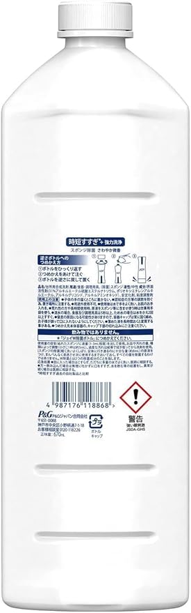 ジョイW除菌は、食器用洗剤としてだけでなく、時短すすぎと強力洗浄を両立した優れものです。5分の時間があれば、すすぎ不要で食器を洗浄できます。ボトルに付属のスポンジで泡立てて、汚れた食器にかけるだけで簡単に洗浄できます。食器の隅々までしっかり洗浄し、さわやかな香りが残ります。洗浄力に優れた成分が汚れを落とし、ボトルにも入れ替えて使えるので経済的です。詰め替え用の670mlの大容量サイズで、長期間ご使用いただけます。