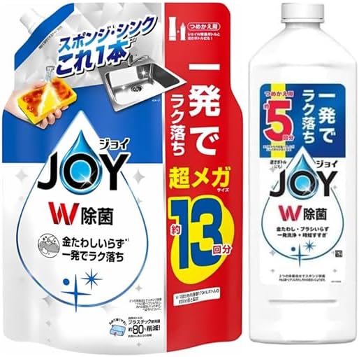 ジョイ W除菌 食器用洗剤 さわやか微香 つめかえ用 超特大ジャンボサイズ 時短すすぎ*+強力洗浄 三大汚れも一発洗浄** ヌメヌメプラスチック容器, ギトギトフライパン, こびりつき鍋 2つの除菌成分でスポンジ除菌 約11.5回分 ※1回分を通常ボトル内容量170mLの約8分目と設定 閉めて保存できるキャップ付き ジョイW除菌ボトルと逆さボトルにも! *時短すすぎ 過去の自社製品と比較 **三大汚れはプラスチック容器・フライパン・鍋についた食べ物汚れを指します。汚れの度合いにより、汚れ落ちの程度は異なります。長時間にわたって焼き付いた汚れなどは落ちない場合があります。 原材料・成分 界面活性剤 (30% アルキルエーテル硫酸エステルナトリウム、ポリオキシエチレンアルキルエーテル、アルキルグリコシド、アルキルアミンオキシド)、安定化剤、粘度調整剤