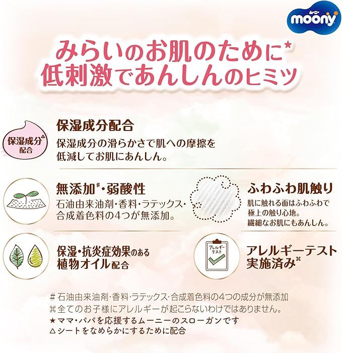 ●オーガニックコットン配合表面シートで、ふわふわな肌触り。●無添加弱酸性●3種の無添加植物オイル配合(オリーブオイル・ホホバオイル・ライスオイル)●アレルギーテスト実施済●有害物質を含まない世界最高の安全性「エコテックスRスタンダード100」を取得。