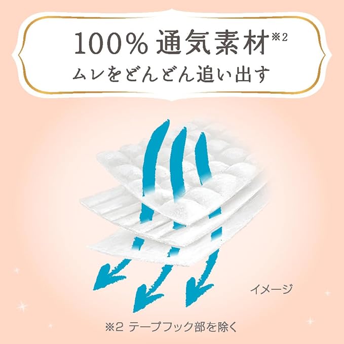 ・【100%通気素材*】おしっこ直後のおむつの中は湿度80%以上になることも(花王調べ)。おむつ全面でムレを追い出すからお肌はいつもさらさら。*テープフック部材を除く