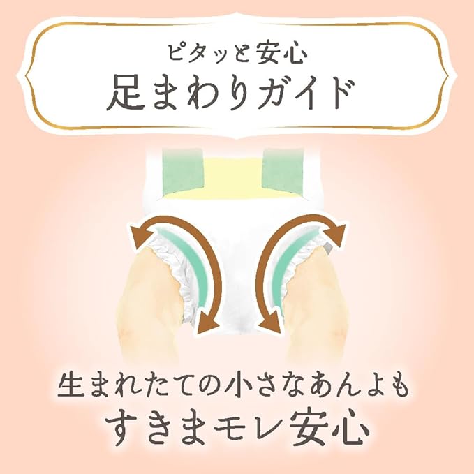 ・【ふんわりエアinクッション】独自のふんわり凹凸シートで、肌あたりやわらか。生まれたばかりの赤ちゃんのゆるゆるうんちもしっかりキャッチ&吸収し、肌につきにくい設計。横モレ防止フィットギャザー付