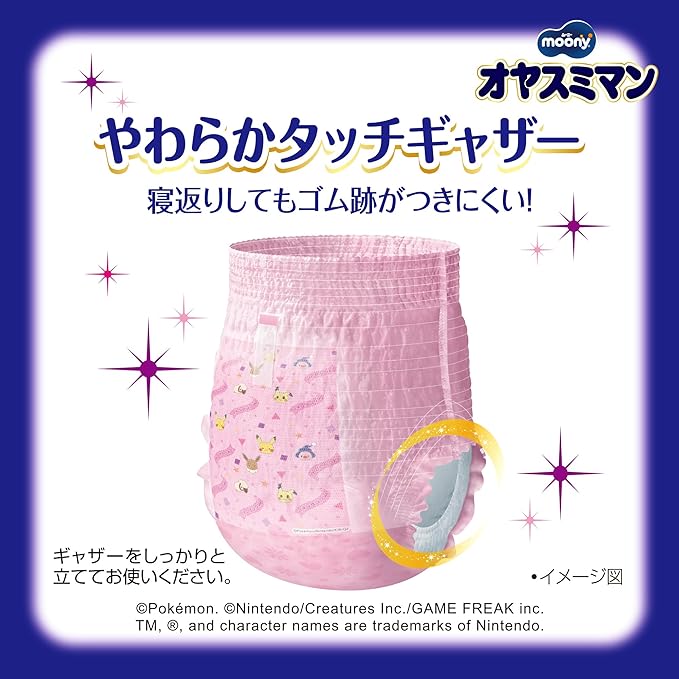 オヤスミマンはおしっこ8回分の吸収力で、朝までモレ0へ!オヤスミマンビッグ以上サイズよりも一回り大きい安心設計。やわらかタッチギャザーで寝返りしてもゴム跡がつきにくい!ポケモンデザイン搭載♪