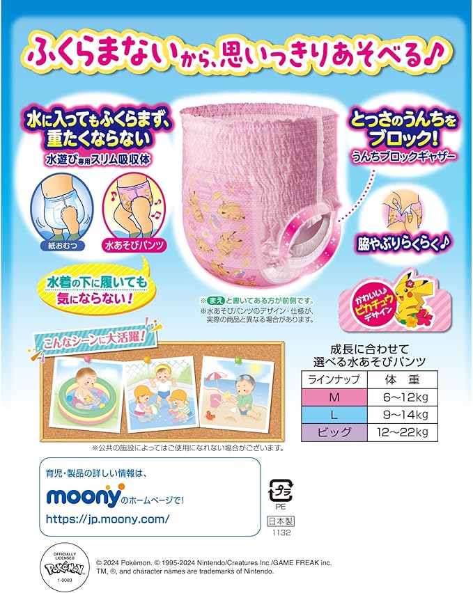 新改良!水あそび専用「スリム吸収体」採用で水に入ってもふくらまず、重くならないから、動きやすく思いっきり水あそびを楽しめます♪また、「うんちブロックギャザー」搭載で、とっさのうんちモレも安心。さらにデザインもワクワク&かわいいピカチュウデザインで楽しい水あそびをさらに盛り上げます!