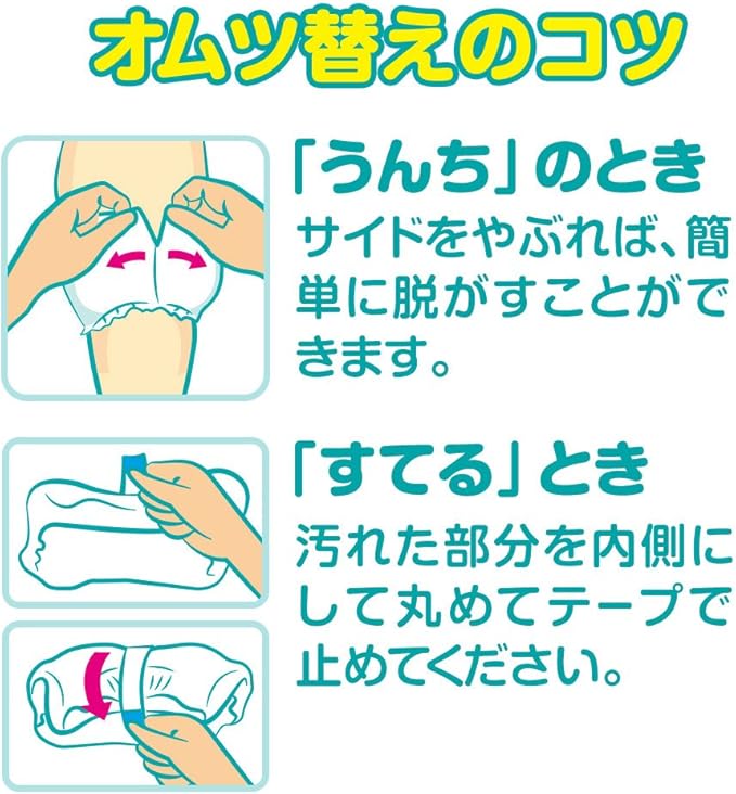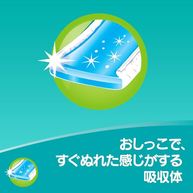 パンパース オムツ 卒業パンツ ビッグ 。 トイトレにオススメのおむつです。 ぬれた感じがするシートでおしっこに自分で気づくきっかけをつくります。 吸収力は、安心のおしっこ3回分。万が一、失敗しても大丈夫。 もちろんパンパースだから、お肌にやさしい紙オムツ。 便利なおしっこお知らせサインつき。 テープが付いている方がうしろです