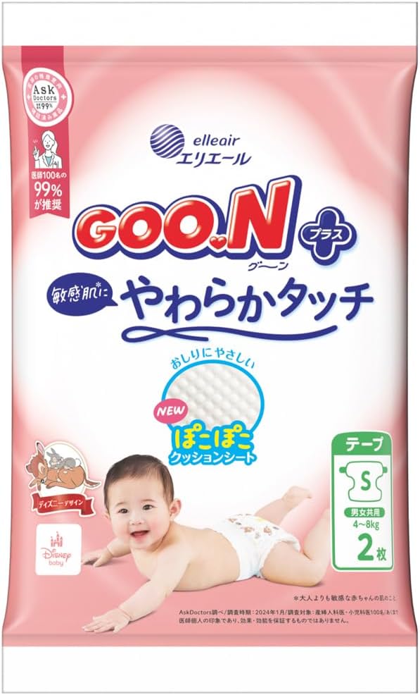 【テープ Sサイズ】グーンプラス 敏感肌にやわらかタッチ おむつ (4~8kg) 2枚