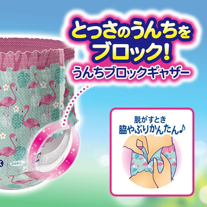 水あそび専用「スリム吸収体」採用で水に入ってもふくらまないから動きやすい! ぴったりフィットして楽しく水あそびができます♪また、「うんちブロックギャザー」で、とっさのうんちもブロック。デザインもわんぱく&キュートな水着デザインで楽しい水あそびをさらに盛り上げます!