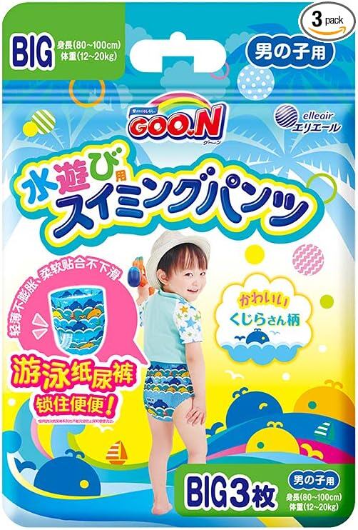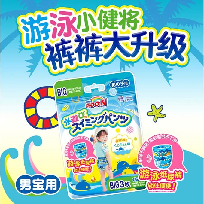 「グーン スイミングパンツ BIGサイズ 男の子 3枚入」は、赤ちゃんが安心して、楽しく遊べる使いきりタイプのBigサイズの水着です。水に入ってもふくらまず、超うす吸収体採用で、いつも体にぴったりフィットしています。手を汚さず簡単に交換できます。立体ポケットギャザー採用で、とっさのウンチをせきとめます。全面に泳ぎが上手な、動物・魚のイラストがデザインされています。海や川、公園の水場で、おうちのミニプールで、スイミングスクールで。*プール等の公共施設によっては、ご使用になれない場合があります。事前に施設管理者にご確認の上、ご使用願います。
