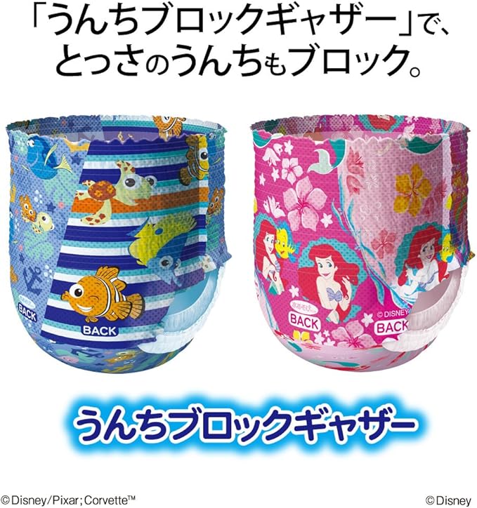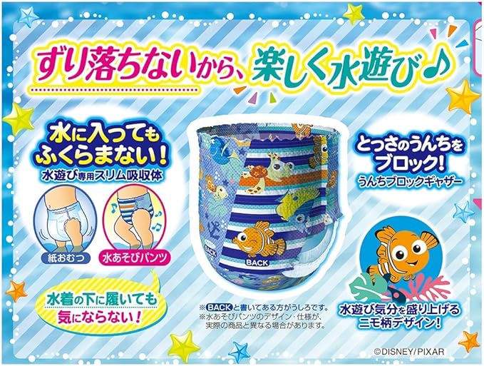 水あそび専用「スリム吸収体」採用で水に入ってもふくらまないから動きやすい! ぴったりフィットして楽しく水あそびができます♪また、「うんちブロックギャザー」で、とっさのうんちもブロック。デザインもわんぱく&キュートな水着デザインで楽しい水あそびをさらに盛り上げます!