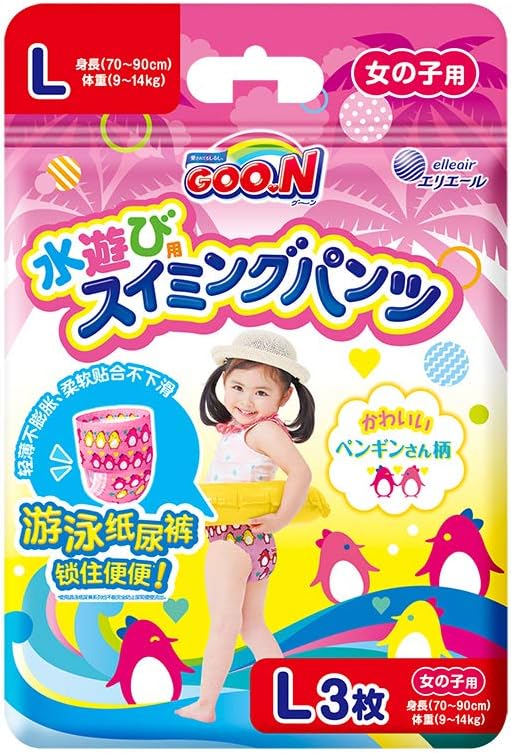 「グーン スイミングパンツ Lサイズ 女の子 3枚入」は、赤ちゃんが安心して、楽しく遊べる使いきりタイプのLサイズの水着です。水に入ってもふくらまず、超うす吸収体採用で、いつも体にぴったりフィットしています。手を汚さず簡単に交換できます。立体ポケットギャザー採用で、とっさのウンチをせきとめます。全面に泳ぎが上手な、動物・魚のイラストがデザインされています。海や川、公園の水場で、おうちのミニプールで、スイミングスクールで。*プール等の公共施設によっては、ご使用になれない場合があります。事前に施設管理者にご確認の上、ご使用願います。