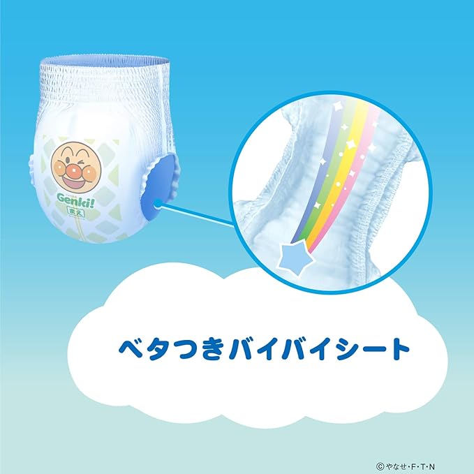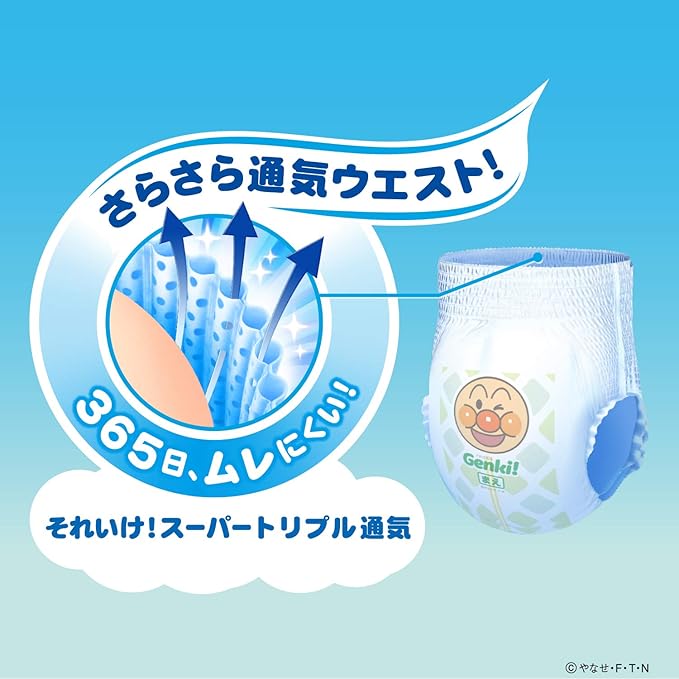 2013年9月19日発売。新ラインナップ登場!ネピアGenki!パンツBigより大きいサイズ(目安体重 13~25Kg)は、全面通気とおなか通気ウェーブで、こもりがちな湿気を外に発散。お肌はいつもさらさら。おなか周りのフィット性が抜群。元気に動いてもズレ落ちないので、隙間が出来ず、モレを防ぎます。おなか周りはネピアGenki!だけの3層構造。ゴムがお肌にあたらず、おなかをやわらかく包み込みます。脚まわりと股下がすっきり!モコモコしないで、歩きやすいパンツです。夜も安心の吸収力で、おねしょ用として使用できます。