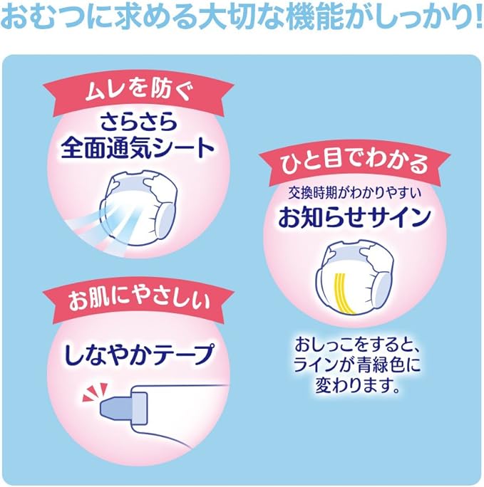 材質:表面材-ポリオレフィン不織布、吸収材-ポリエステル不織布/ポリオレフィン不織布/綿状パルプ/高分子吸収材、防水材-ポリオレフィンフィルム、止着材-粘着テープ、伸縮材-合成ゴム、結合材-ホットメルト粘着材、外装材-ポリエチレン