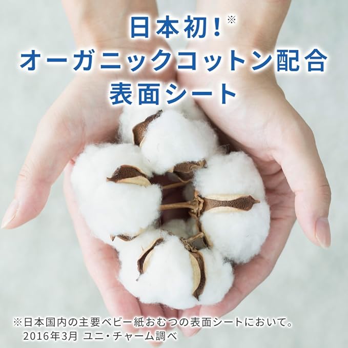 「ナチュラルムーニーマン」は、日本初*「オーガニックコットン配合シートのおむつ」です。*日本国内の主要ベビー紙おむつの表面シートにおいて。2016年3月ユニ・チャーム調べ。