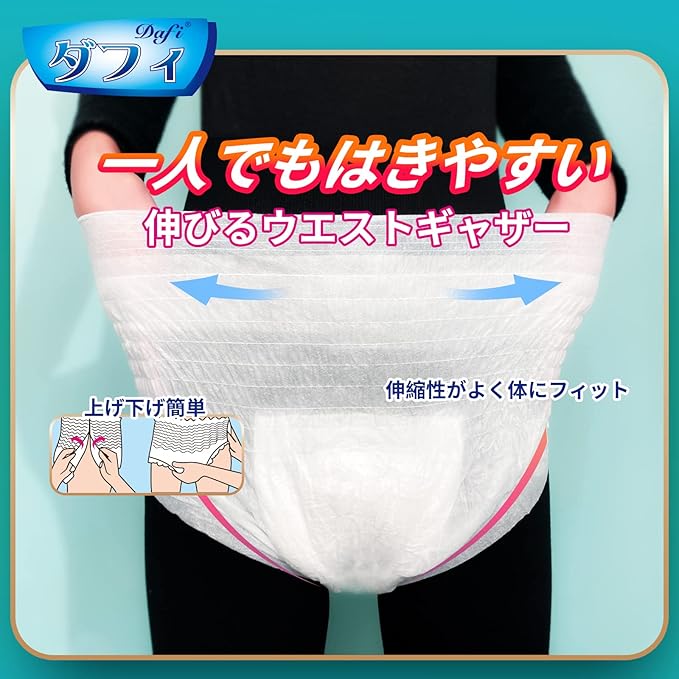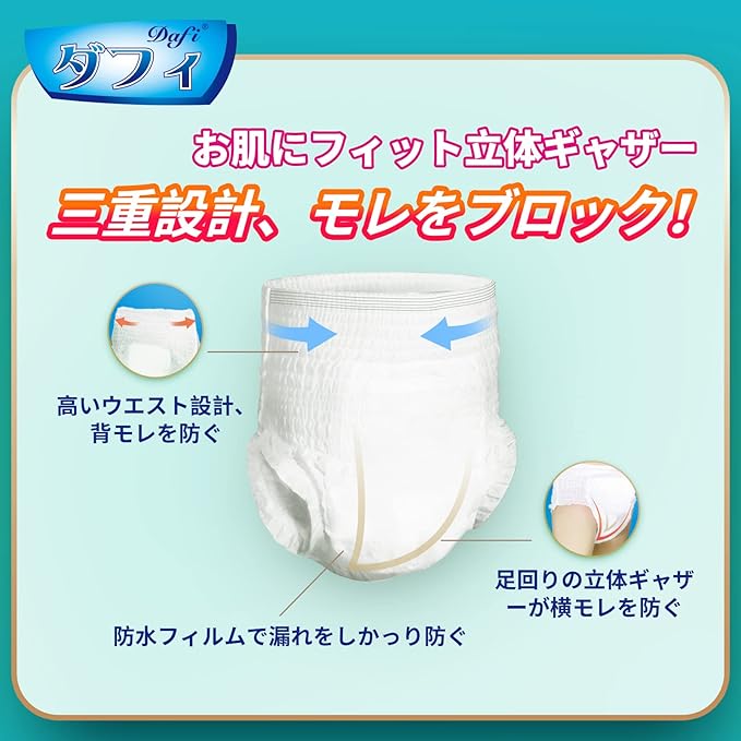 【使いやすい設計】ダフィ大人用オムツはハイウエストデザインを取り入れ、お体にぴったりフィットし、背モレを効果よく 防ぎます。また、もも回りも立体ギャザー設計で、股モレをしっかりガードします。