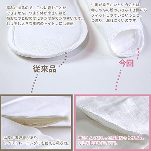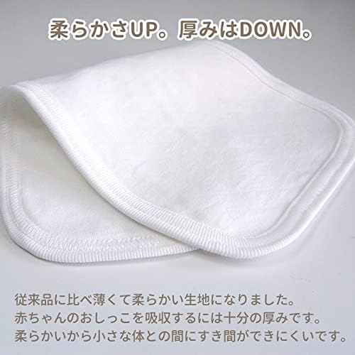 【柔らかさUP、厚みはDOWN】従来品に比べ薄くて柔らかい生地になりました。赤ちゃんの小さな体との隙間ができにくい柔らかさと、おしっこを吸収するのには十分な厚みの乾きやすい布オムツです。
