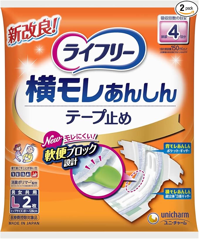 【お試しパック】 ライフリー テープ止めおむつ 横モレあんしんテープ止め Lサイズ 2枚 4回吸収 【寝て過ごすことが多い方】